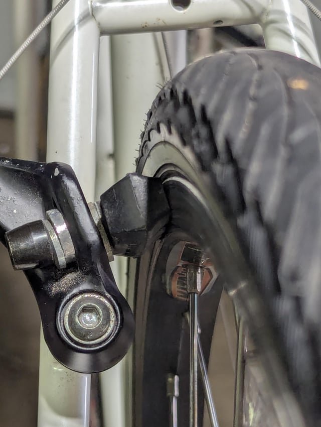 Check both brake arms for evenness. Squeeze the brake lever slowly. Notice if one arm moves more than the other. Uneven movement means adjustment is needed. Look for the pivot bolt on each arm. This is where adjustments happen. Make sure both arms have the same tension.